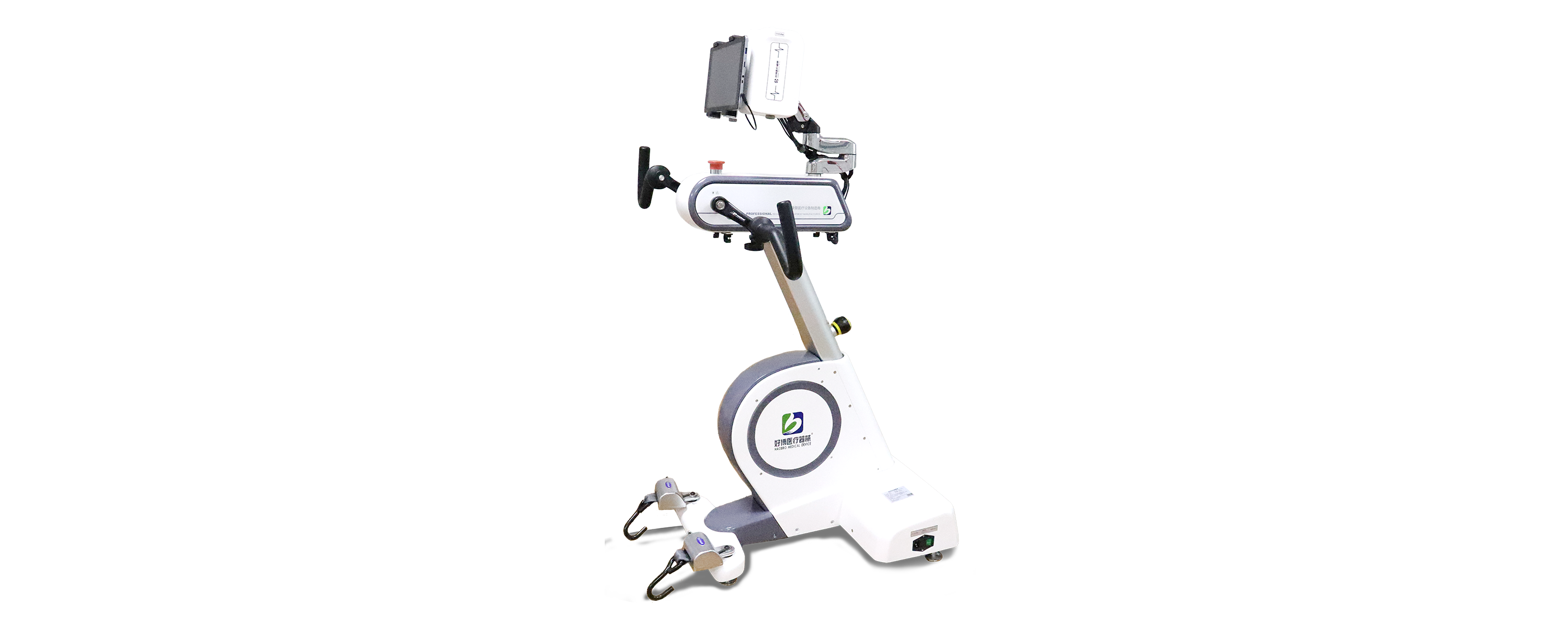根据预设参数输出给定信号,将多通路、程序化的FES与运动相结合,支配及诱发相应的肌肉发生收缩,同时设备通过电机带动患者或患者主动训练使肢体末端沿定轴作圆周运动,从而对上肢或下肢的整个肢体(包括肩、肘、腕、指、髋、膝、踝关节和相关肌群)进行综合运动训练,以增强患者关节活动度和肌力。